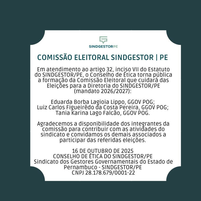 Em atendimento ao artigo 32, inciso VII do estatuto do SINDGESTOR/PE, o Conselho de Ética torna pública a formação da Comissão Eleitoral que cuidará das Eleições para a Diretoria do SINDGESTOR/PE (mandato 2026/2027):